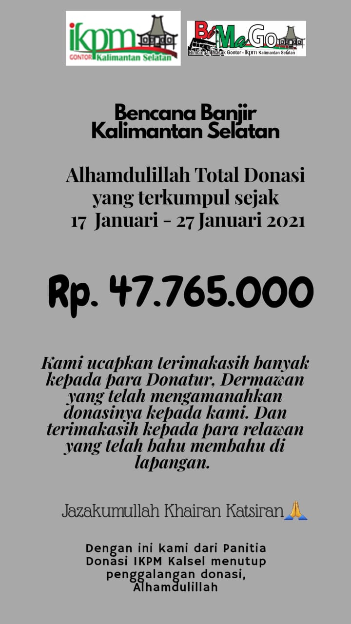 Ikatan Keluarga Pondok Modern (IKPM) Gontor cabang Kalimantan Selatan terus mengalirkan donasi bantuan bencana banjir, Kamis (28/1/2021). Dalam rilis yang _Gontornews_ terima, IKPM Kalsel telah menyalurkan dana sebesar Rp 47.765.000,- dalam rentang 17 sampai 27 Januari 2021.