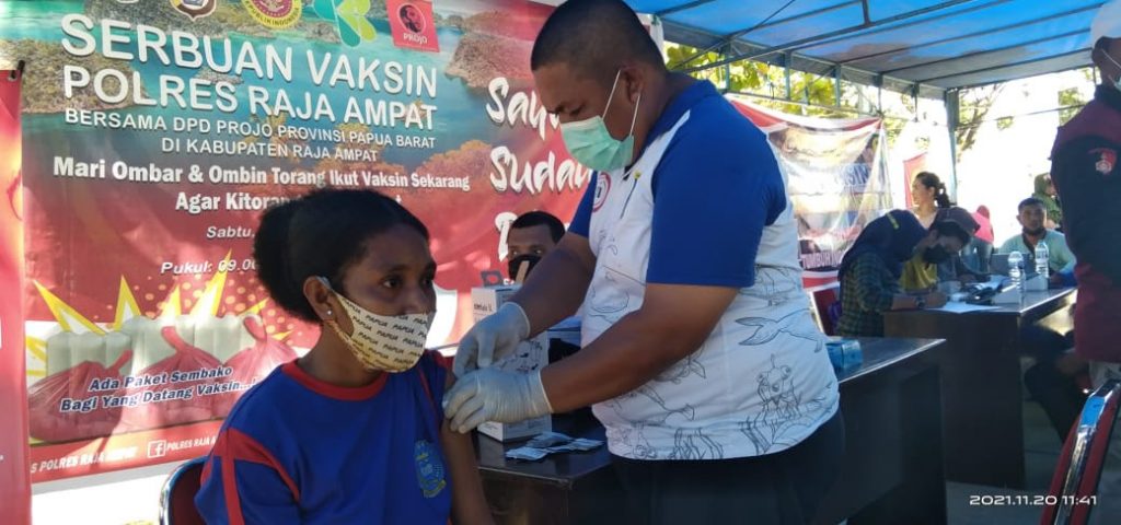 Serbuan Vaksinasi Polres Raja Ampat bersama DPD Projo Provinsi Papua barat, Sabtu 20/11/2021), bertempat di Pantai WTC.
