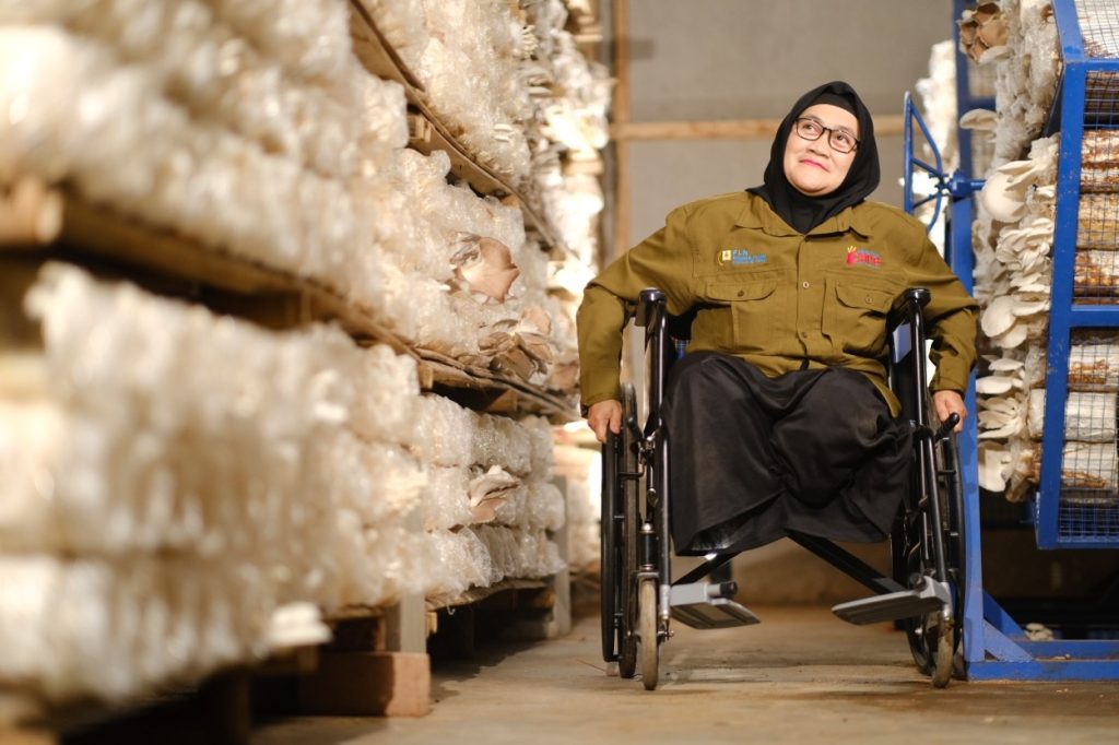 “Awalnya saya mengidap diabetes sehingga harus kehilangan kedua kaki, namun saya tidak patah semangat dan bahkan saat ini saya berani untuk bercita-cita melalui budidaya jamur ini saya dapat hidup mandiri,” ujar Wiwin.